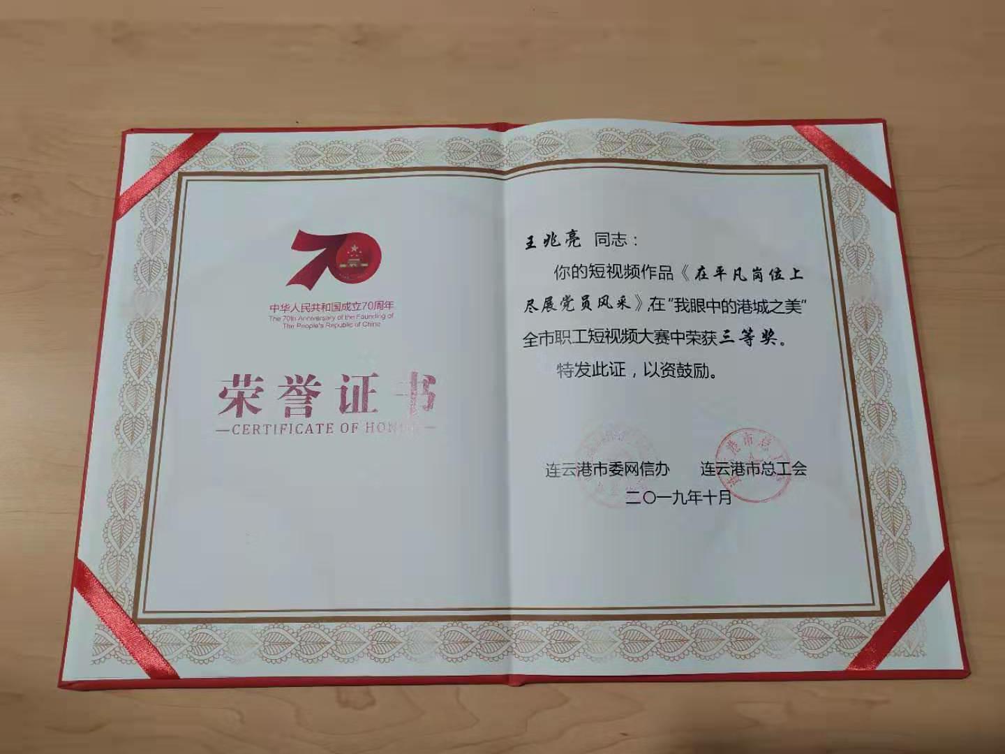 2019年是新中國成立70周年,為了充分展示新中國成立70周年以來連云港市取得的輝煌成就和創(chuàng)建全國文明城市的豐碩成果,同時,也為了進一步提升連云港市職工網(wǎng)絡(luò)文化品質(zhì),滿足廣大職工網(wǎng)民日益增長的精神文化需求,構(gòu)建清朗的網(wǎng)絡(luò)空間,為連云港經(jīng)濟社會發(fā)展?fàn)I造良好的網(wǎng)絡(luò)輿論環(huán)境,市委網(wǎng)信辦、市總工會于6月中旬聯(lián)合開展全市職工慶祝新中國成立70周年——“我眼中的港城之美”網(wǎng)絡(luò)主題宣傳活動。修理公司王兆亮同志選送的短視屏《在平凡崗位上盡展黨員風(fēng)采》在“我眼中的港城之美”全市職工短視頻大賽中榮譽三等獎。