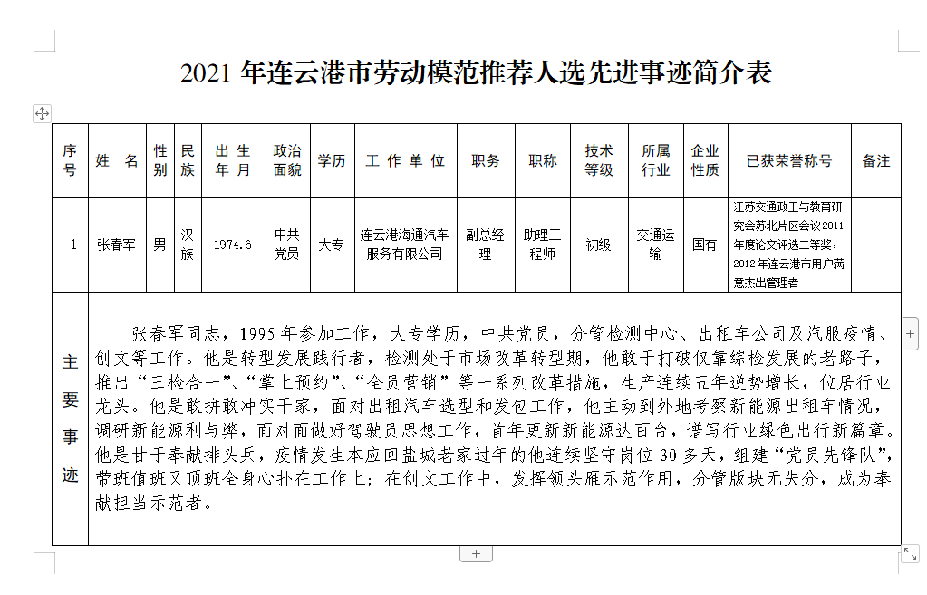 附件:2021年連云港市勞動(dòng)模范推薦人選先進(jìn)事跡簡(jiǎn)介表