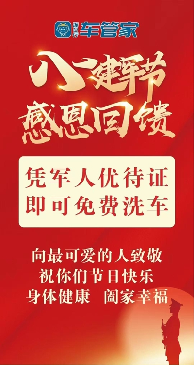 有一種擔當,叫保家衛(wèi)國;有一種奉獻,叫戎馬丹心。值此“八一”建軍節(jié)來臨之際,汽服公司“連e行”車管家以“紅色傳承 迎八一”為主題,特別推出擁軍專屬活動——用細致服務致敬軍魂,以實際行動傳承紅色基因,向每一位現(xiàn)役、退役軍人致以最崇高的敬意,讓尊崇與溫暖直抵心間。